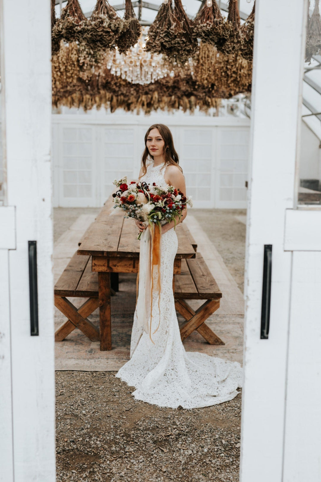 Our newest venue, The Arbor House, is a 2,000-square-foot space designed to host large-scale weddings and events of up to 200 guests. Climate-controlled for year-round comfort, it features ample seating, grand chandeliers, and The Kinlands’ signature design charm, taking the work out of styling your day. Dried florals hang gracefully from the rafters, creating a warm, organic atmosphere, while the spacious open floor plan allows for a variety of layouts, from banquet-style dining to expansive dance floors. Large windows invite natural light during the day, while soft, layered lighting transforms the space for evening gatherings. With its balance of rustic elements and refined details, The Arbor House is ideal for hosting larger celebrations.