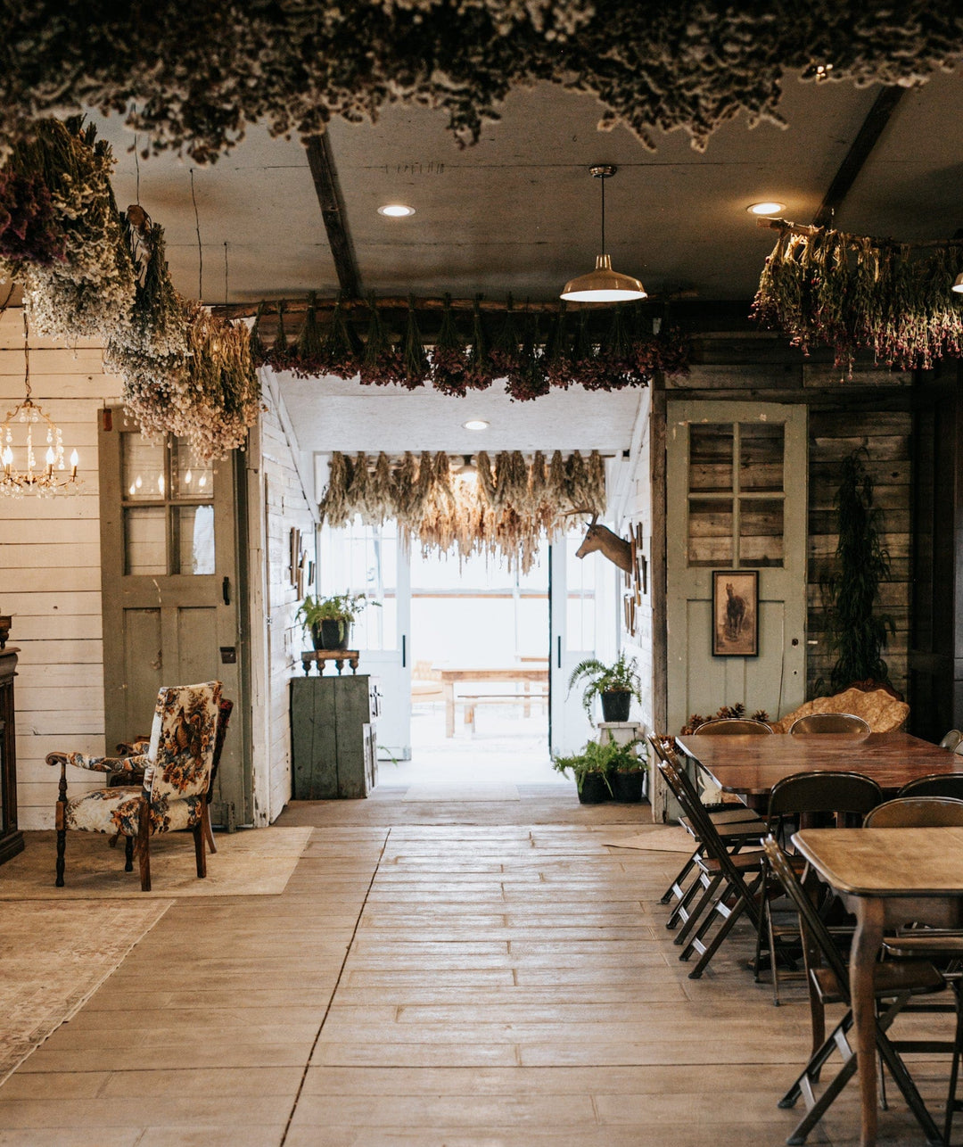 The Arbor House is a nature-centered venue with a warm, refined atmosphere that feels both welcoming and stately. Dried florals drift overhead in the rafters, chandeliers glow across antique tables and wood walls, and intimate vignettes of vintage sofas create inviting pockets for conversation. The porch opens into a small secret garden with swings, bistro lights, tables beneath a canopy of hops, and a rose tunnel that adds quiet romance. Inside, a seasonal tree serves as a natural focal point, bringing a touch of wild magic to the room in every season.
